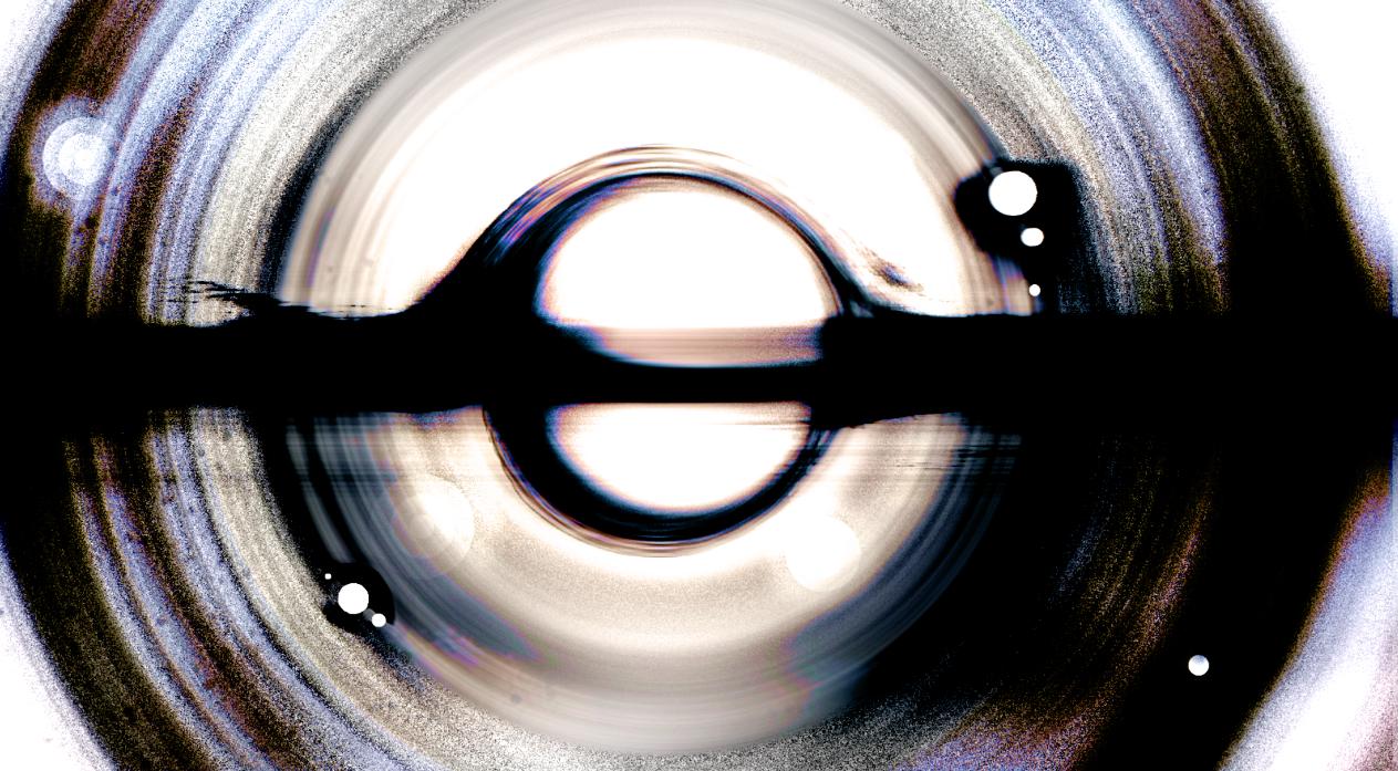 Take careful note of outer accretion sphere about the boarder and around the phenomenon's threshold horizon, the distortion of light of particulates inside the distortion and the changing frequencies of light in accordance with changes in depth as the contents shift from predominantly water and ammonia to also including metallic elements (predominantly vaporized mercury), the blackhole and its accresion disk within and the pulsar radiance axially from left to right