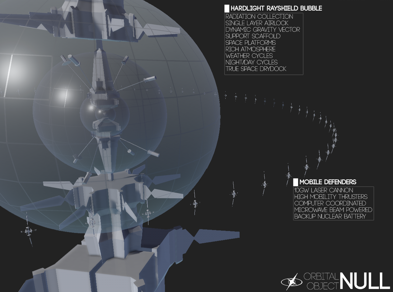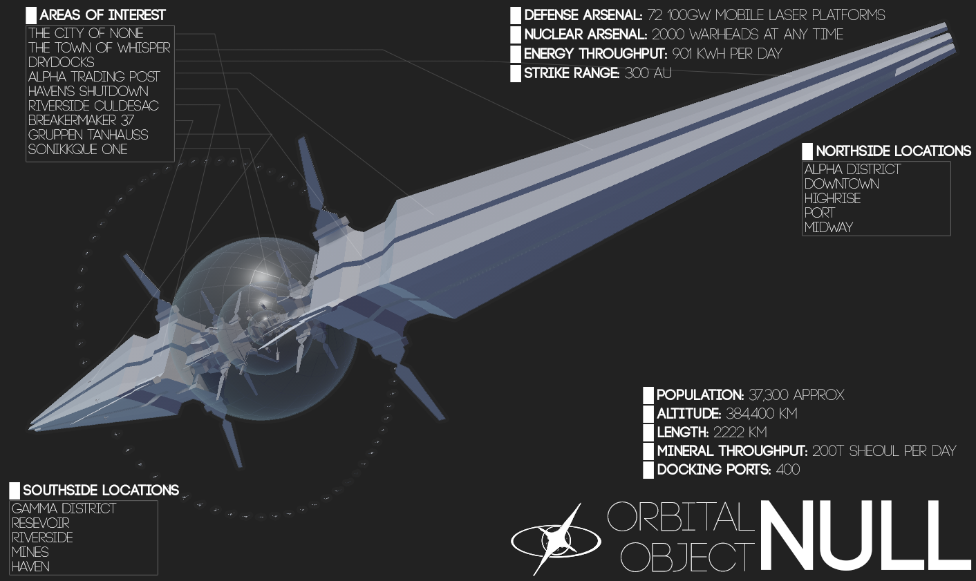 To the eye, Null is a goldfish bowl like sphere containing layers of atmosphere and branching structures of habitat. Branching beyond this carefully managed atmosphere are four enormous towers either side dwarfing the spheres forming two masts in total with branching cooling panels and docking arrays. Wrapped around this large blocky structure is a ring of orbital defense satellites.