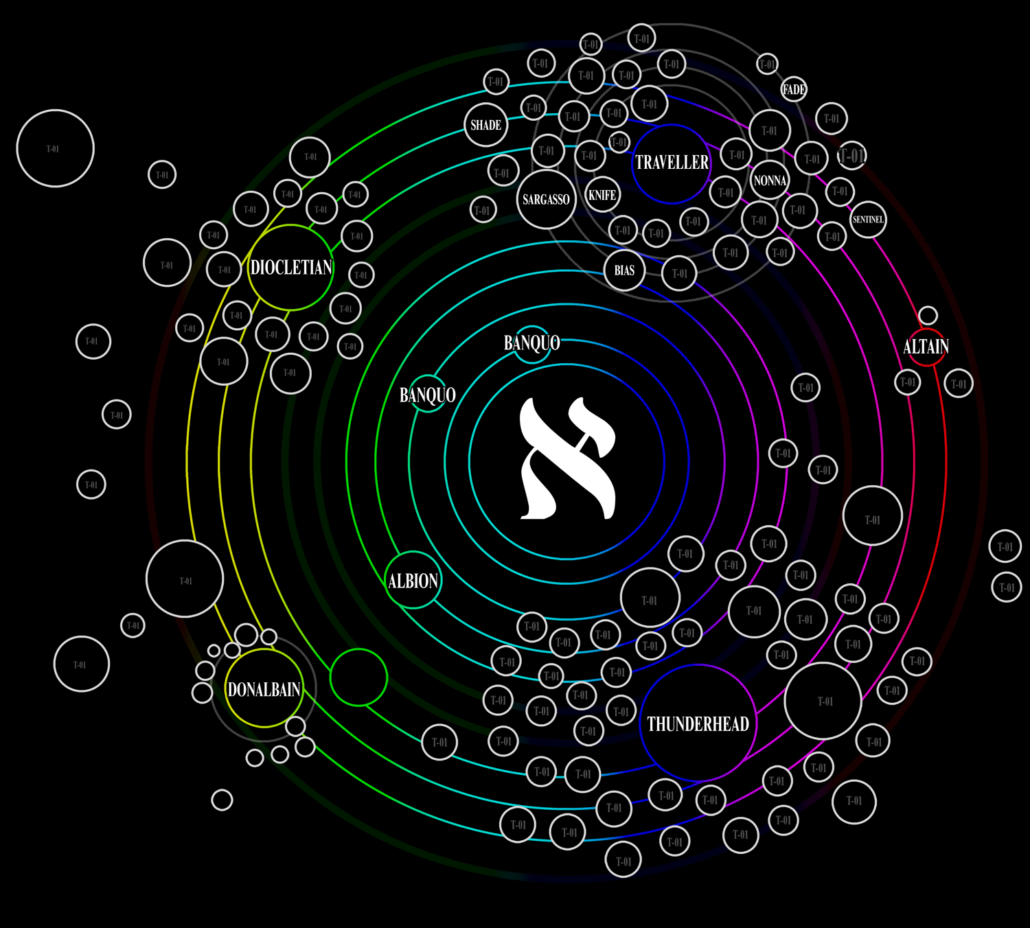 These multi-level platforms, at different orbital altitudes and positions cover the equator of the planet in high orbit and act as a major exchange system of Aleph. Null serves as an inter-dimensional nexus to common exterior systems for transportation, and serves as a mouth in and out of Aleph Null, bypassing the system's walls of maelstrom - acting as a defence wall, stronghold, and checkpoint.